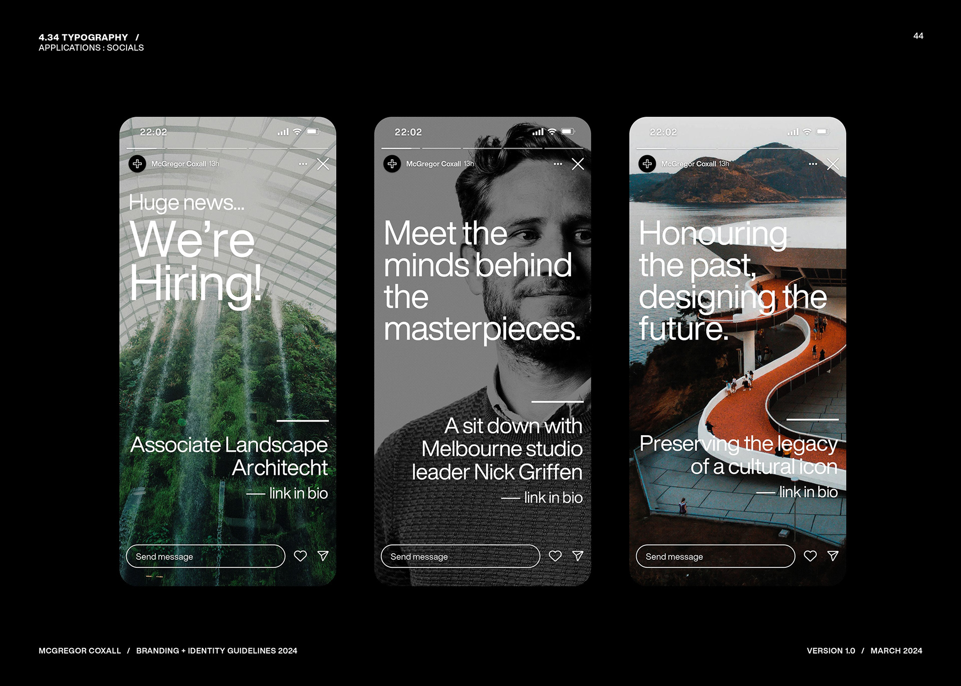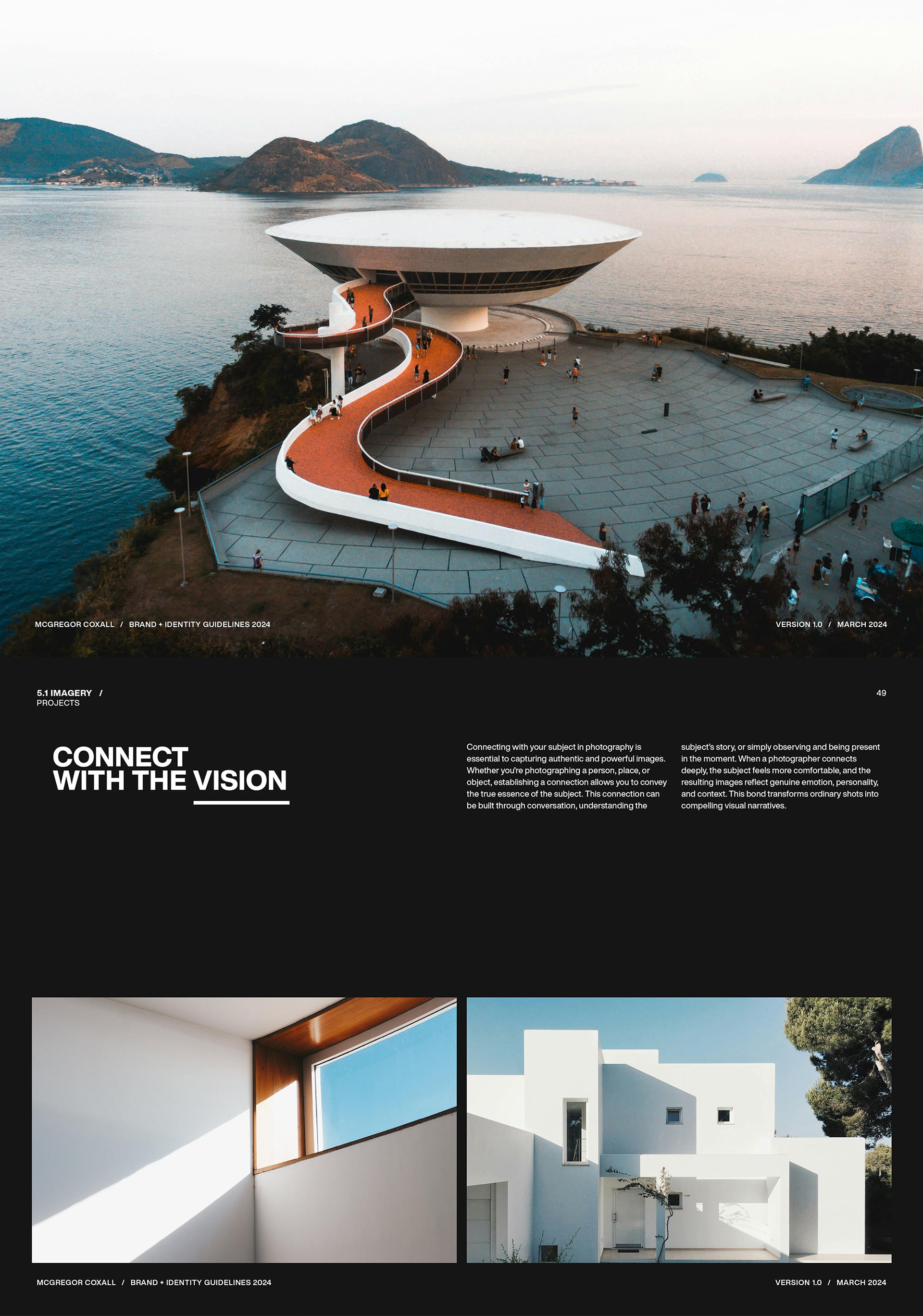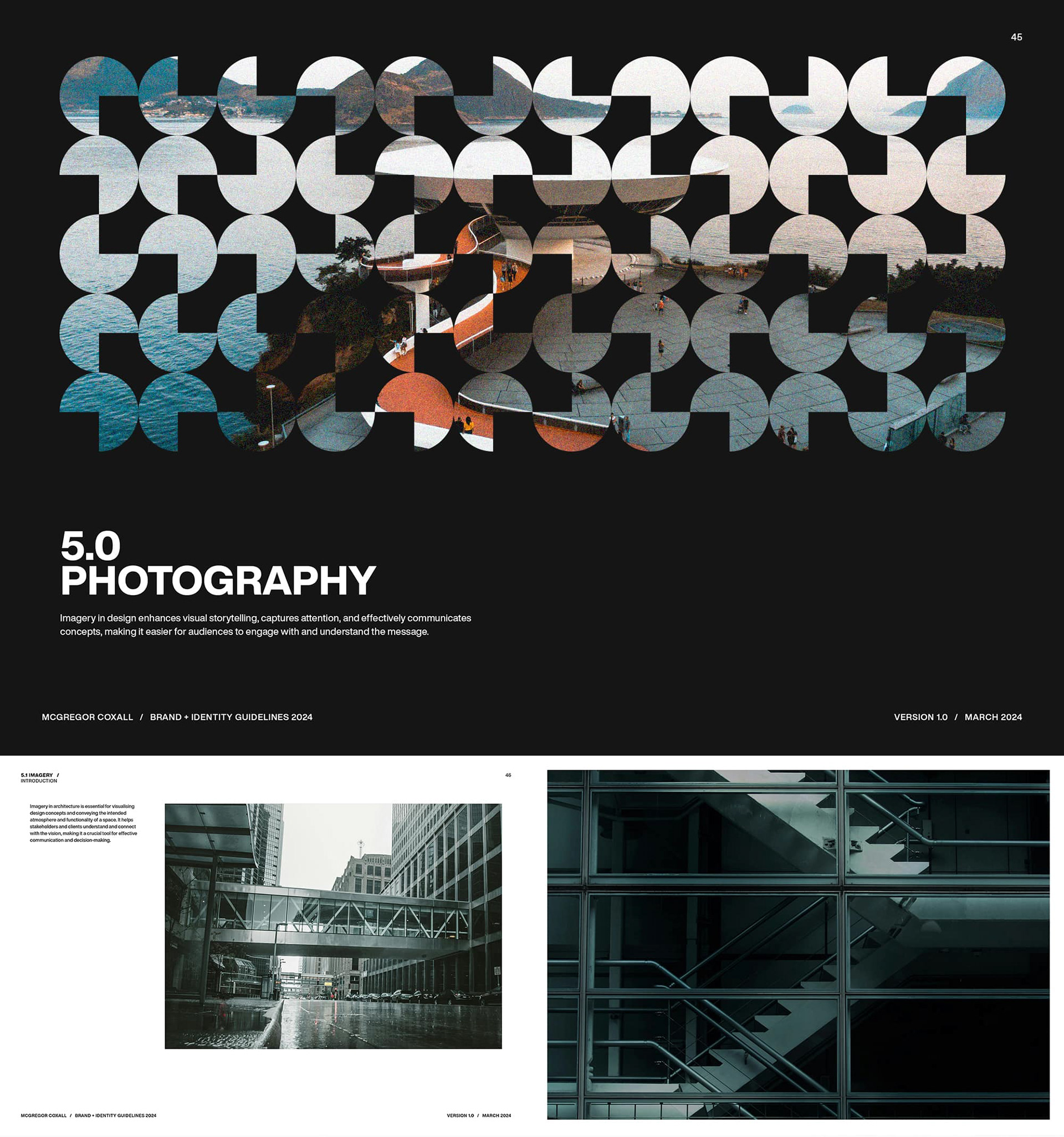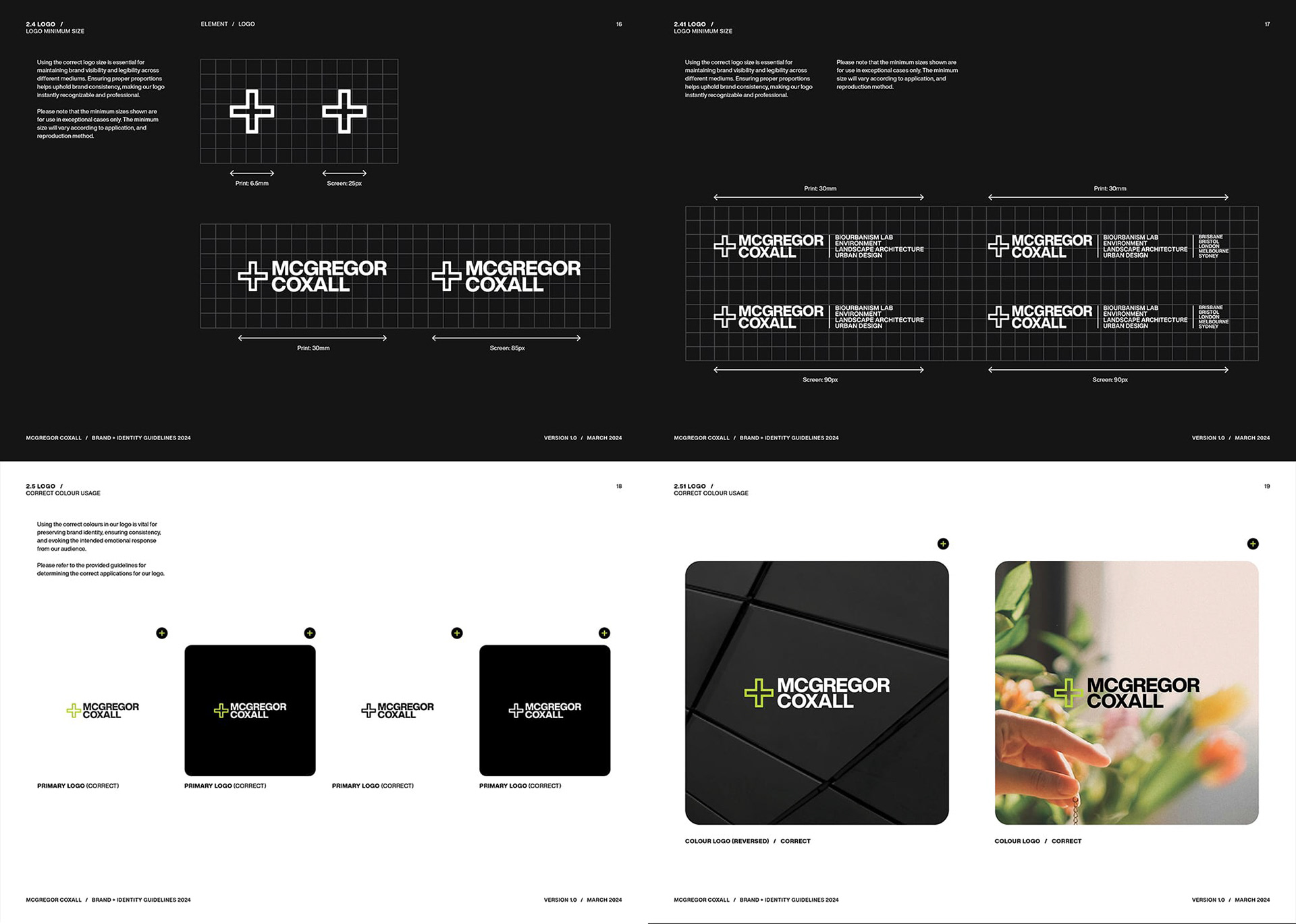 This project presents the first instalment of the 2024 rebrand and identity guidelines for McGregor Coxall. Developed during 2023-2024, these guidelines are the result of an extensive journey involving trialed and accepted improvements to the company's vast range of previously outdated collateral. They encompass an overview of the brand, logo, colour, typography, photography, and iconography.