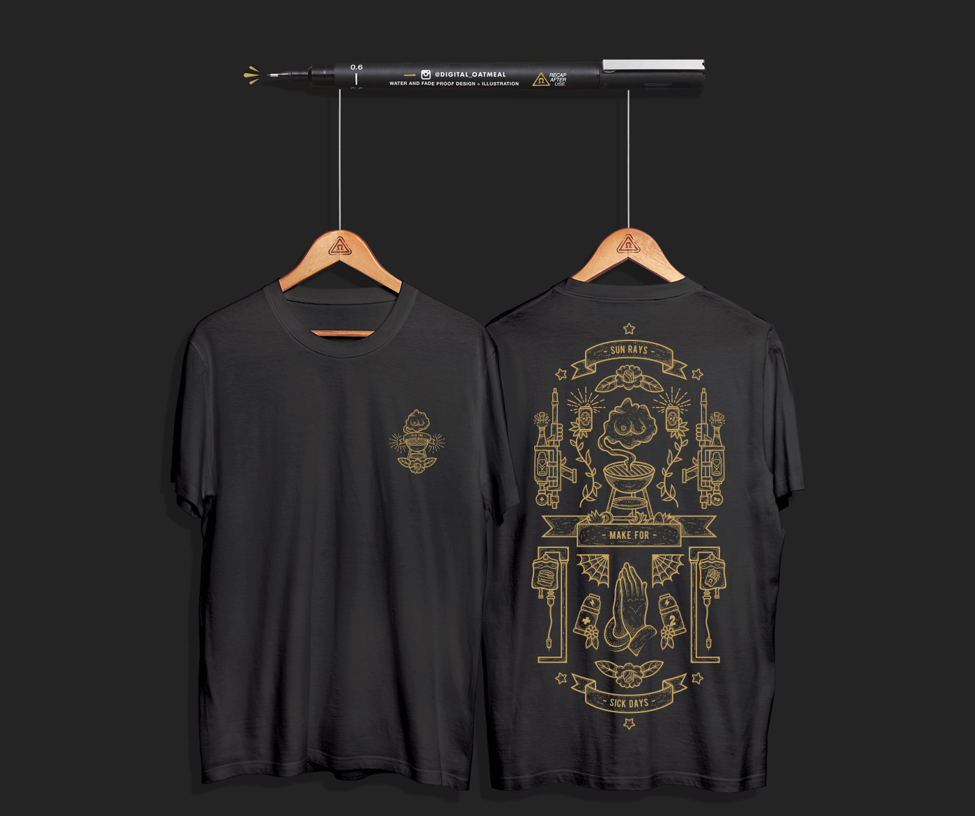 As part of the Plus Two Clothing summer range, I was approached with the concept of the good and evil that comes from a typical Australian Sunday session. Inspired by traditional tattoo flash sheets, the graphics start as fun and games in the sun, drinking over a backyard BBQ the mood suddenly shifts halfway to depict the looming evil awaiting the next day. The pocket and full back design were screen printed as a single colour on a black tee in a modest metallic gold.